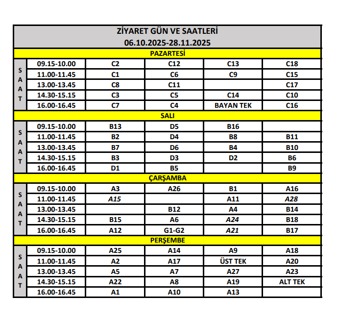 Ziyaretlerinizin yetişebilmesi için ziyaret saatinden 1 saat önce kurumda hazır bulununuz. Ziyaret başladıktan 15 dakika sonrası gelenler ziyaret yapamazlar.